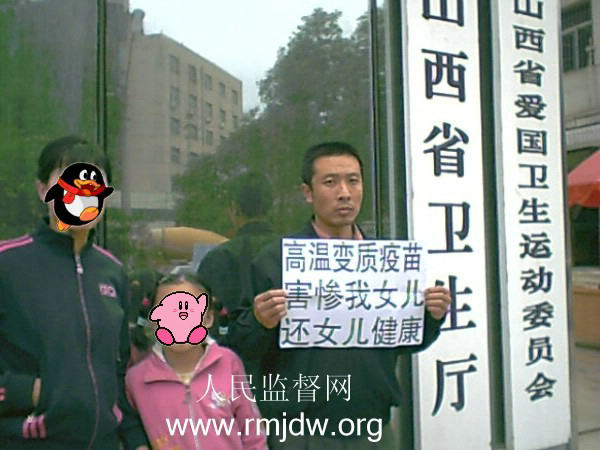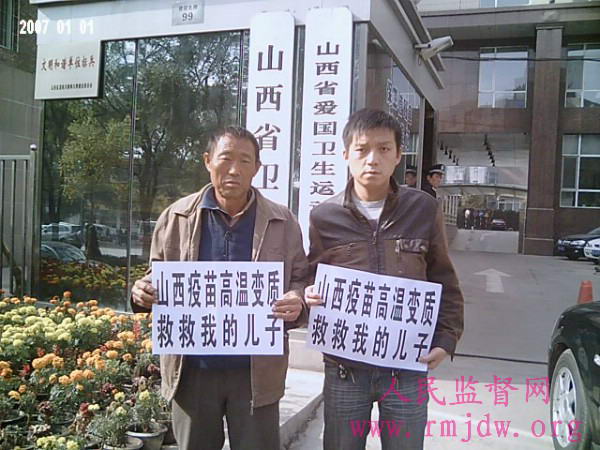 近来我们看了人民监督网上有多篇报道,揭露山西省疾病预防控制中心栗文元、田建国主任等人,把山西省疫苗供应管理权卖给私营公司,为了牟利私自雇佣多名无业人员,长年在楼道里高温、暴光环境下,大批量地往各种疫苗盒上粘贴违法标签,造成06年以来的各类疫苗数十小时高温暴光。并指出疫苗需2-8℃避光储运,高温暴光可生成各种致病物质,高温变质疫苗接种到人身上必然要得病,今天不得病,并不能保证将来不得病。在人民监督网上还登载了许多家庭向省政府、卫生厅的控诉书,他们接种高温变质疫苗后有的死去了宝宝,有的得了抽风脑病,有的肝肾衰竭即将离开人世……。