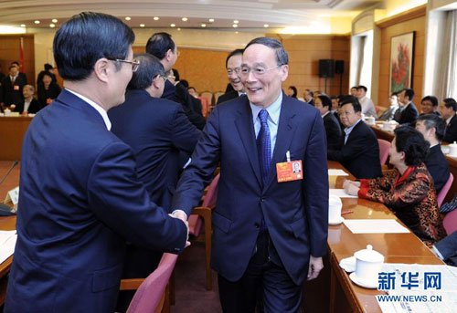 3月4日,中共中央政治局常委、中央纪委书记王岐山看望出席全国政协十二届一次会议的农工党、九三学社界委员并参加联组会。 新华社记者 张铎摄