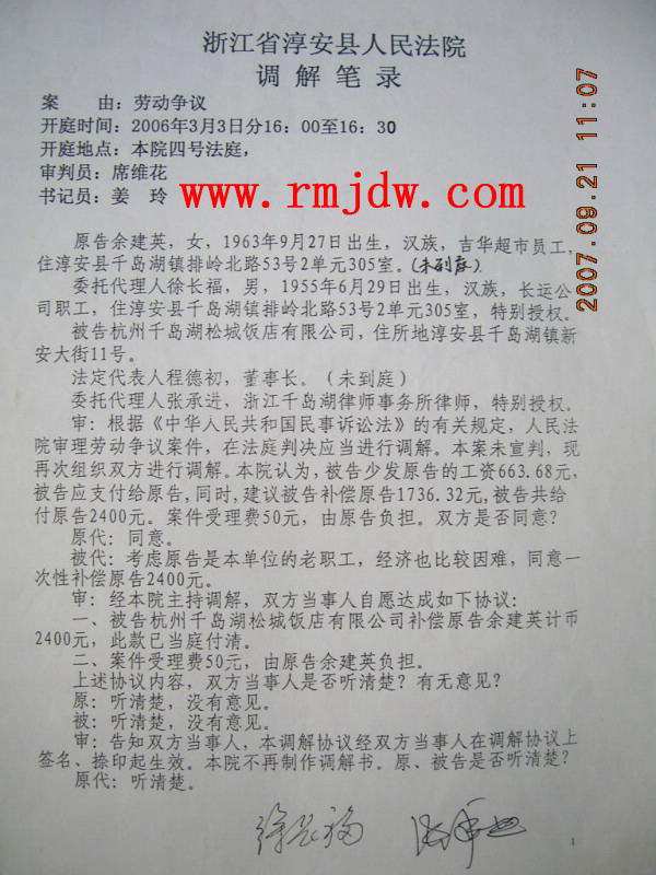 淳安法院法官与被告相互勾结、枉法裁判 文/ 徐长福 余建英 摄影/ 李必胜 淳安县法院在审理原告余建英诉被告杭州千岛湖松城饭店有限公司总经理程德初劳动工资纠纷一案中,法官唐