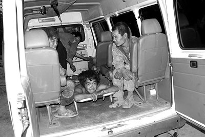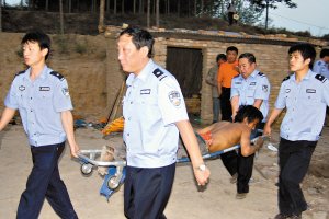 山西洪洞警方用车将被解救的农民工带走。32民工中,有一人被打死,至今有8人神志不清。李廷祯