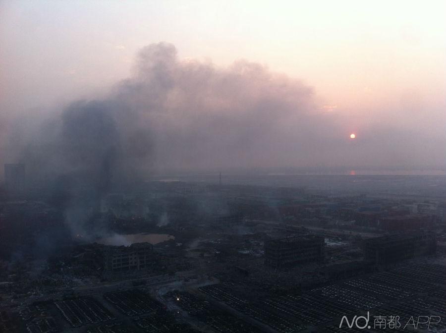 8月15日5:40,天津滨海新区爆炸事故现场,太阳从烟雾中升起。