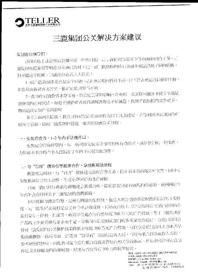 百度作为搜索引擎,是所有网站的集结地,也是大部分消费者获取搜索信息的主要阵地,对三鹿来说将是公关环节的重量级媒体。目前在百度上享受新闻公关保护政策的企业有蒙牛、伊利、汇源等,政策享受起点为自然年度500万元的广告投放,鉴于三鹿集团在产品线上不如其他几家企业丰富,经公司与百度相关部门的多次深度沟通后,百度已经同意将对三鹿集团的公关保护政策降低至年度300万元广告投放,可以享受将目前几大事业部早期负面删除。我可考虑一旦透露“肾结石”负面消息放大后,百度可能会以负面作为要挟,要求增加投放量,因此我司迄今没有跟百度提及肾结石相关负面新闻,所以强烈建议在此事还未大肆曝光的特殊时期,尽快与百度签订300万的框架协议。