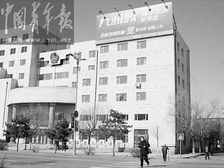 九洲公司在四平市铁西区法院的广告。2005年5月,九洲公司还租用了铁西区检察院大楼墙体做广告。本报记者 刘万永摄
