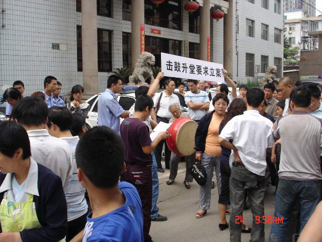 2009年1月20日起,王明亮、易文龙等7个家庭,相继向太原市迎泽区人民法院投递了诉状,状告山西省疾病预防控制中心、北京华卫时代医药技术有限公司制售“山西疾控专用”标签高温暴露疫苗致使其子女被伤害,要求人身损害赔偿。一年来,他们不断口头、书面敦促法院立案,甚至“击鼓升堂,要求立案”,但该法院对于这些民事诉讼,至今不予立案也不驳回。