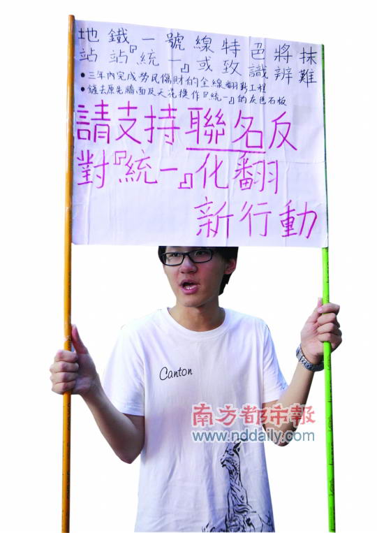 广州第十六中学高一学生陈逸华曾在多个地铁站举起反对牌,“引爆”公众对1号线改造的质疑。