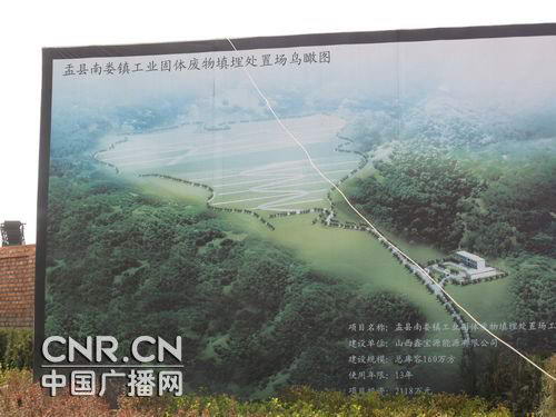 从秀寨村村口顺着煤渣的痕迹,记者很容易就到了“垃圾填埋场”所在的矿山。山脚下,一个硕大的“填埋场立体效果图”吸引了记者的注意。效果图的右下角清楚地标注着项目名称“盂县南娄镇工业固体废物填埋处置场工程”,建设单位是“山西鑫宝源能源有限公司”。