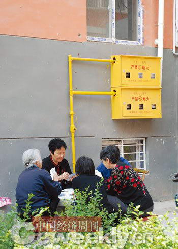 惠民小区的老人围坐在楼门口打牌,头顶上方安装多时的天然气表箱满是尘土。本刊记者 韩文 摄