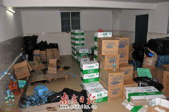 宝丰路加工点规模也比较大,操作流程与金碧路农民房加工点相似,现场查获的假冒矿泉水有200箱。位于三洋湖社区内,警方抓到了一名批发商,并找到了该批发商仓库,查获了一辆装载有假冒矿泉水的人货车。