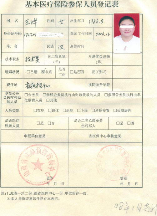 一份山西省疾病预防控制中心内部的《基本医疗保险参保人员登记表》显示:王烨,女,1986年8月出生,参加工作时间2006年12月,民族“汉”,技术职务“技术员”,未婚,现住址“省疾控中心”。