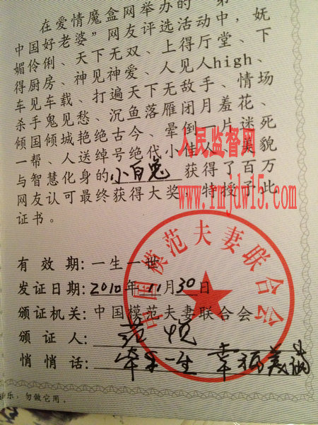 图:中央办公厅高官范悦向情妇纪英男颁发“好夫妻”证书签名