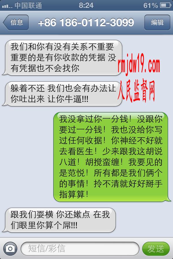 图:中南海高官范悦、浙商金忠等人向纪英男讨债的短信截图