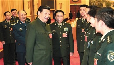 2013年3月11日,十二届全国人大一次会议解放军代表团全体会议结束时,习近平等军委领导接见来自基层的部分军队人大代表。 新华社记者 李刚 摄