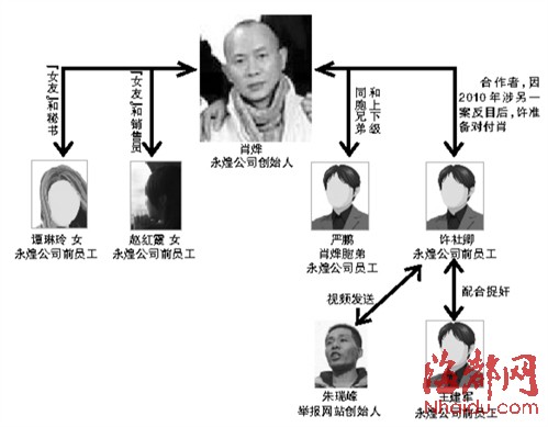 肖烨等人敲诈勒索案涉案人物示意图 【重庆:肖烨等人敲诈勒索案6月20日开庭因涉及个人隐私将不公开审理】记者7日从重庆市渝北区人民法院获悉,肖烨、许社卿、严鹏、赵红霞等六