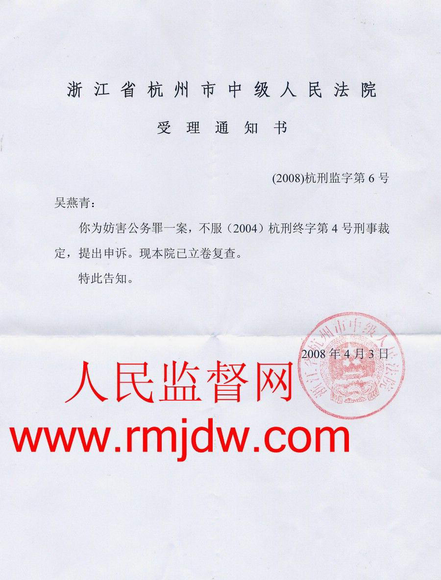 2008年4月3日,杭州市中级人民法院向受害人吴燕青邮寄受理通知书,对吴燕青不服妨害公务罪一案的申诉立卷复查。