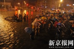 昨晚,暴雨使广渠门桥下一片汪洋,五辆车搁浅水中,救援人员赶来拖拽水中车辆。 昨晚,广渠门桥下,群众自发帮助救援人员拖拽水中车辆。 为确保安全,救援人员拉着绳子在水中