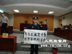 湖北省襄樊市中级人民法院地下审判一庭,湖北省襄南监狱一级警督张德勇头戴警徽、身着警服端坐上诉席上。