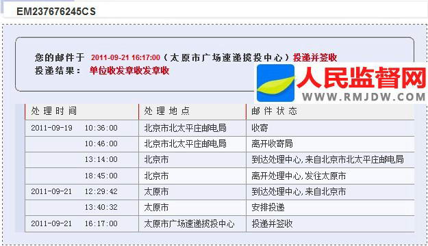 经查询,2011年9月21日16点17分贵部用单位收发章签收了该函件。