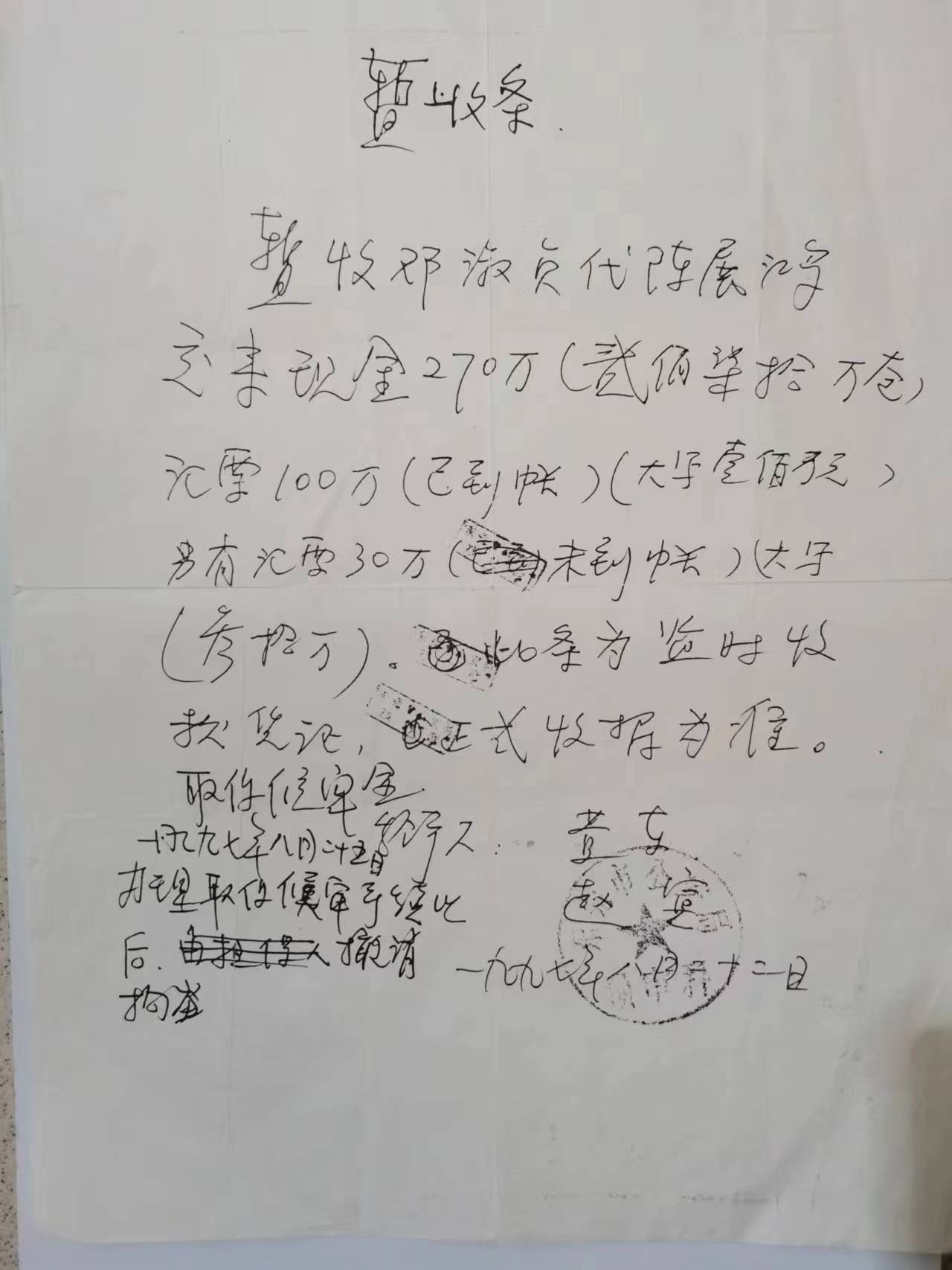前不久,记者在广州采访了原广州市荔湾区工商联会长丁肇萱女士。她告诉人民监督网:“陈展鸿先生于1997年4月20日被东莞市公安局拘留,要求400万元取保金才放人,我应陈展鸿家属要求,于1997年8月22日早上和区工商联办公室主任、电工、女司机四个人,与另一部车由邓淑贞和司机,我们共携带270万现金从广州开车去东莞,向东莞市公安局代表黄东交纳并出具暂收条单据。黄文仔的100万已到账,最后为等30万汇票暂未到账,拖到下午5点多钟才去看守所提放陈展鸿出来。当时,我们看到陈展鸿出来时被剃光了头,我们事先准备了假发,马上帮他戴上,并迅速开车离开东莞返回广州市。”