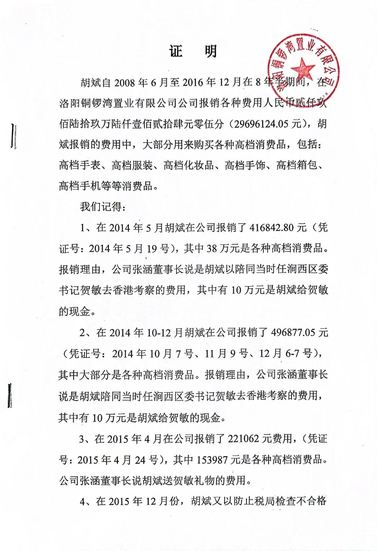 洛阳铜锣湾置业有限公司开发建设的“洛阳铜锣湾广场项目”位于洛阳市涧西区城市核心地段。规划建设用地约230亩,规划总建筑面积约110万平方米,全部开发建设完成后,预计销售利润约27亿。项目全部建成后,将成为洛阳市一个地标性的城市综合体。项目一期工程于2014年2月办理完国有土地使用证手续、建设用地规划许可证手续,至206年一期工程桩基施工已完成一半。但是由于受到涧西区政府招商引资所推荐的皮包公司骗子胡斌的欺骗,由其担任公司法定代表人,在其主持公司日常工作期间利用各种手段,胡斌职务侵占公款合计约6000万元,其中:贪污公款约3000万元;在公司欺骗董事长,提供发票虚报冒领公款约2900万元,(其中胡斌与当时区委书记现任副市长贺敏两人相互勾结,胡斌侵占公款相当大的一部分行贿给了贺敏。另外,胡斌于2014年5月陪同贺敏去深圳、香港考察花费约38万元;于2014年10月陪同贺敏及家属去深圳、香港游玩花费约40万元;于2015年4月给贺敏购物送礼报销发票原件15张153987元,以上三项合计约93.4万元,在公司保存。见附件)(胡斌于2022年9月2日已经被市中级人民法院判刑10年,见附件1)造成工程资金链断裂,项目已停工多年并形成大量的债务,其中一百多个债权人已向有关区级法院和中级法院分别提出诉讼取得判决书并申请法院执行,还有三百多个债权人没有提出诉讼(见附件)。胡斌侵占、挪用公款数额巨大,2019年8月21日已经被公安机关刑事立案追查。但是一直没有被采取刑拘措施,主要原因是由于原涧西区区委书记现任洛阳市副市长贺敏的竭力保护。